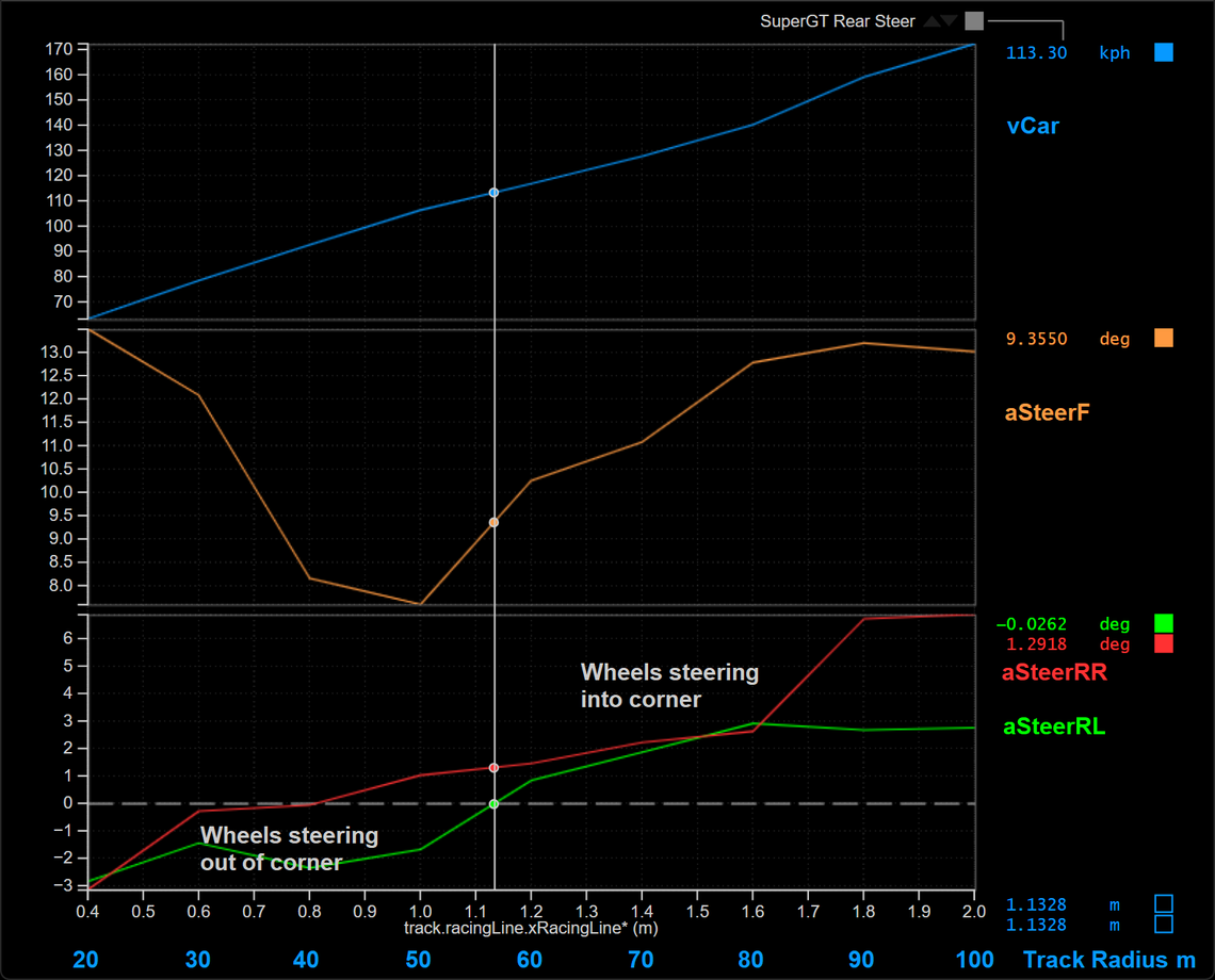 The rear wheel angle (green and red) is now picked by the solver. At low speed (below 113kph), the rear wheels are steering out of the corner in the opposite direction to the steering wheel. Above this speed, the rear wheels are steering in the same direction as the front. So far so good, all in keeping with how the early pioneers designed this system.