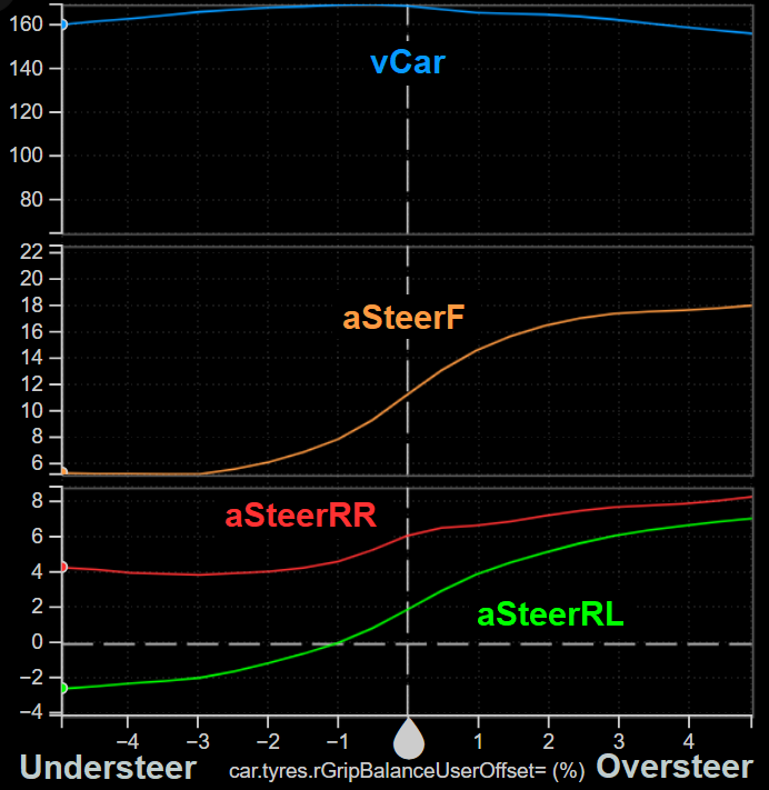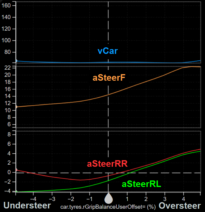 It is straightforward in Canopy to set up a Monte Carlo simulation of combinations of Grip Balance x Track Radius. Grip Balance of +1% pushes the car balance towards oversteer, and is equivalent to 2% more front grip, and 2% less rear grip which is a sizable change.