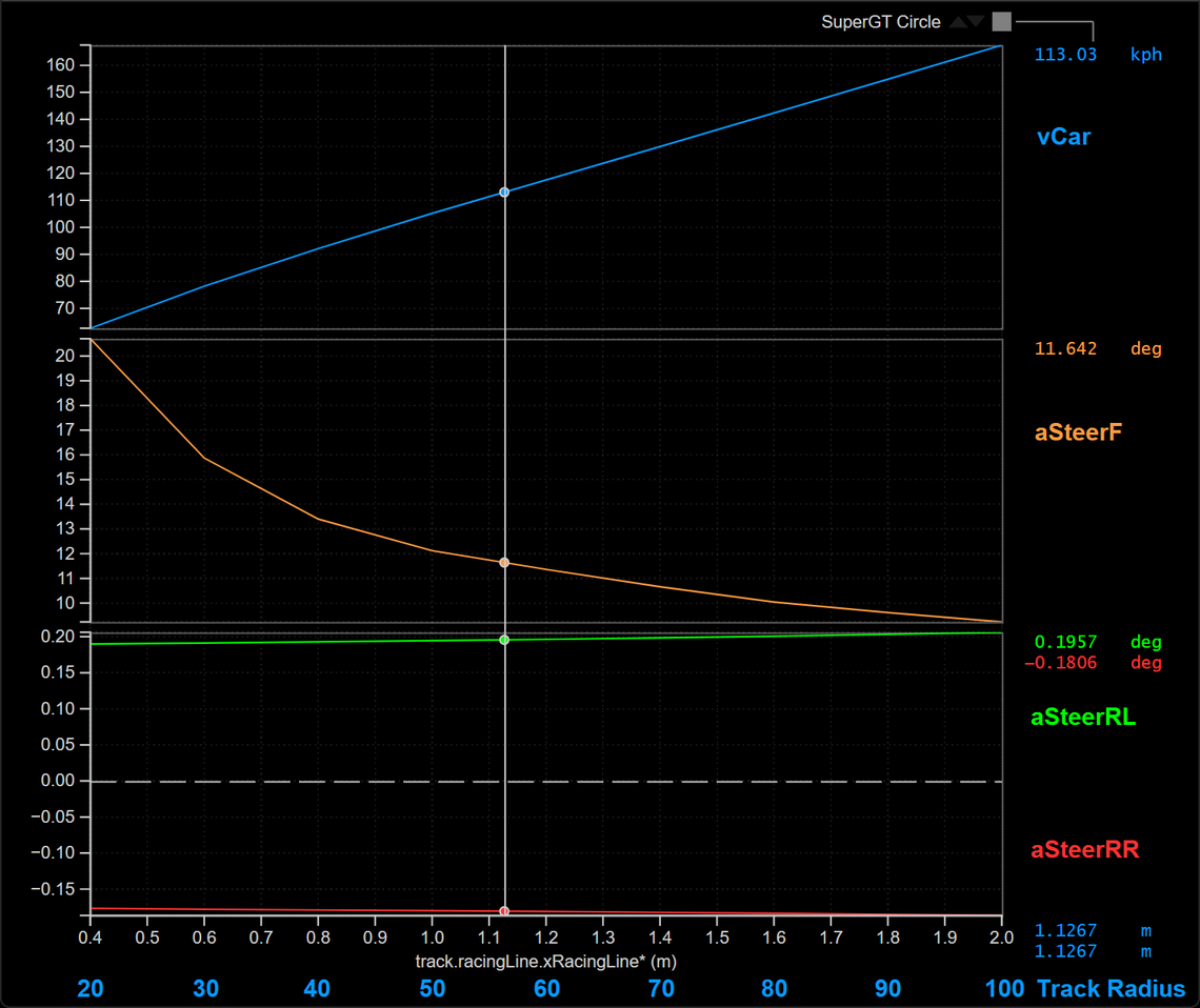 Moving the sliders to the extremes of track radius, the optimum rear steering angle changes in the interactive graph below.